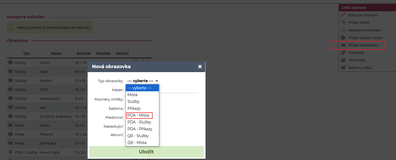 Přes záložku POS → Lokality otevřete detail lokality, která bude mobilního číšníka využívat. V sekci Další operace zvolte možnost Přidat obrazovku a vyberte typ obrazovky PDA-Místa.