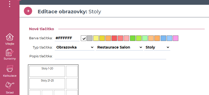Pokud potřebujete na obrazovku přidat větší množství stolů, můžete na hlavní obrazovku stolů přidat další obrazovky, vhodně je pojmenovat a do nich pak přidat jednotlivé stoly: