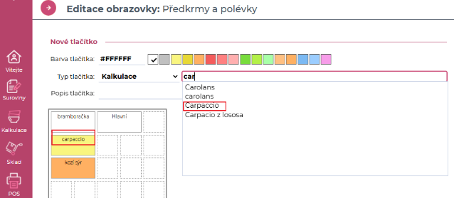 V detailu nové obrazovky pak přidejte tlačítka pro jednotlivé kalkulace, které budou číšníci prodávat. Stačí vybrat typ tlačítka Kalkulace (případně Kalkulace - seznam) a umístit ho na obrazovku stejně, jak jste zvyklí při nastavování klasických obrazovek do Vento POS: