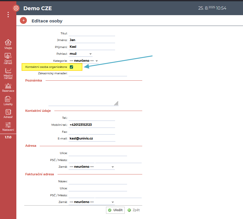 1. Nejprve je potřeba v adresáři (Adresář - Osoby) u daného adresního záznamu určit, že se jedná o kontaktní osobu. V detailu osoby stačí zaškrtnout tlačítko Kontaktní osoba: