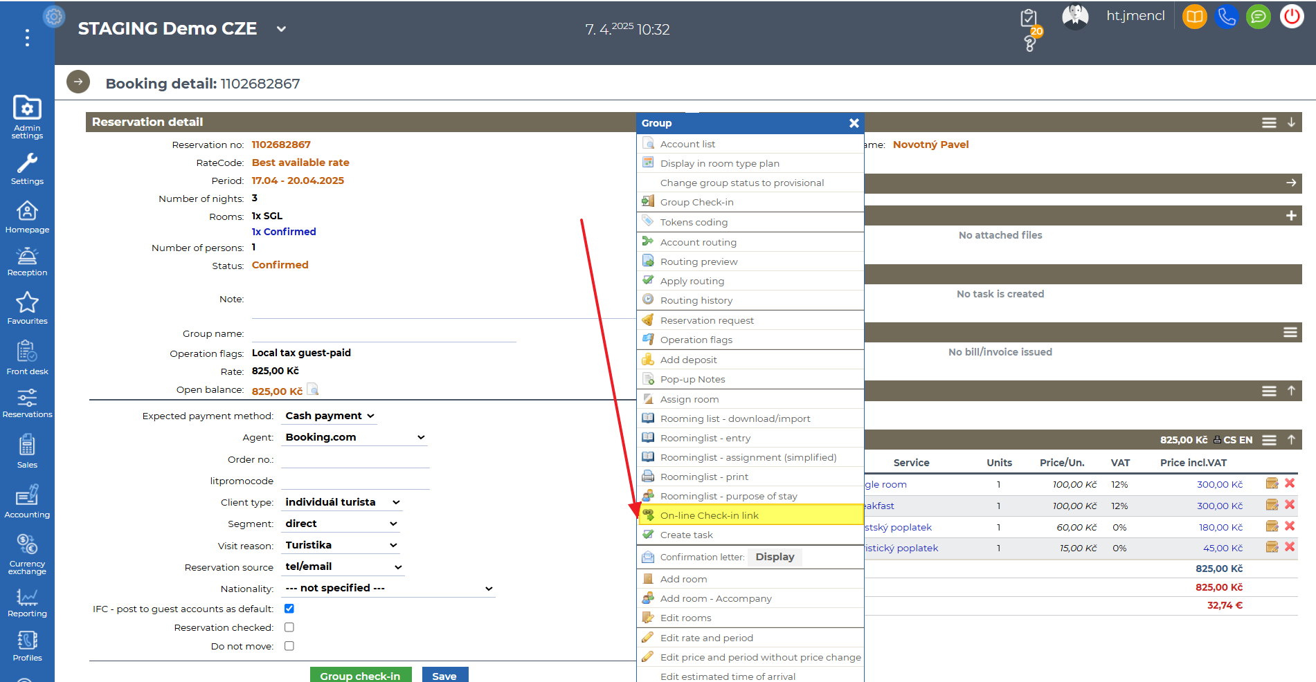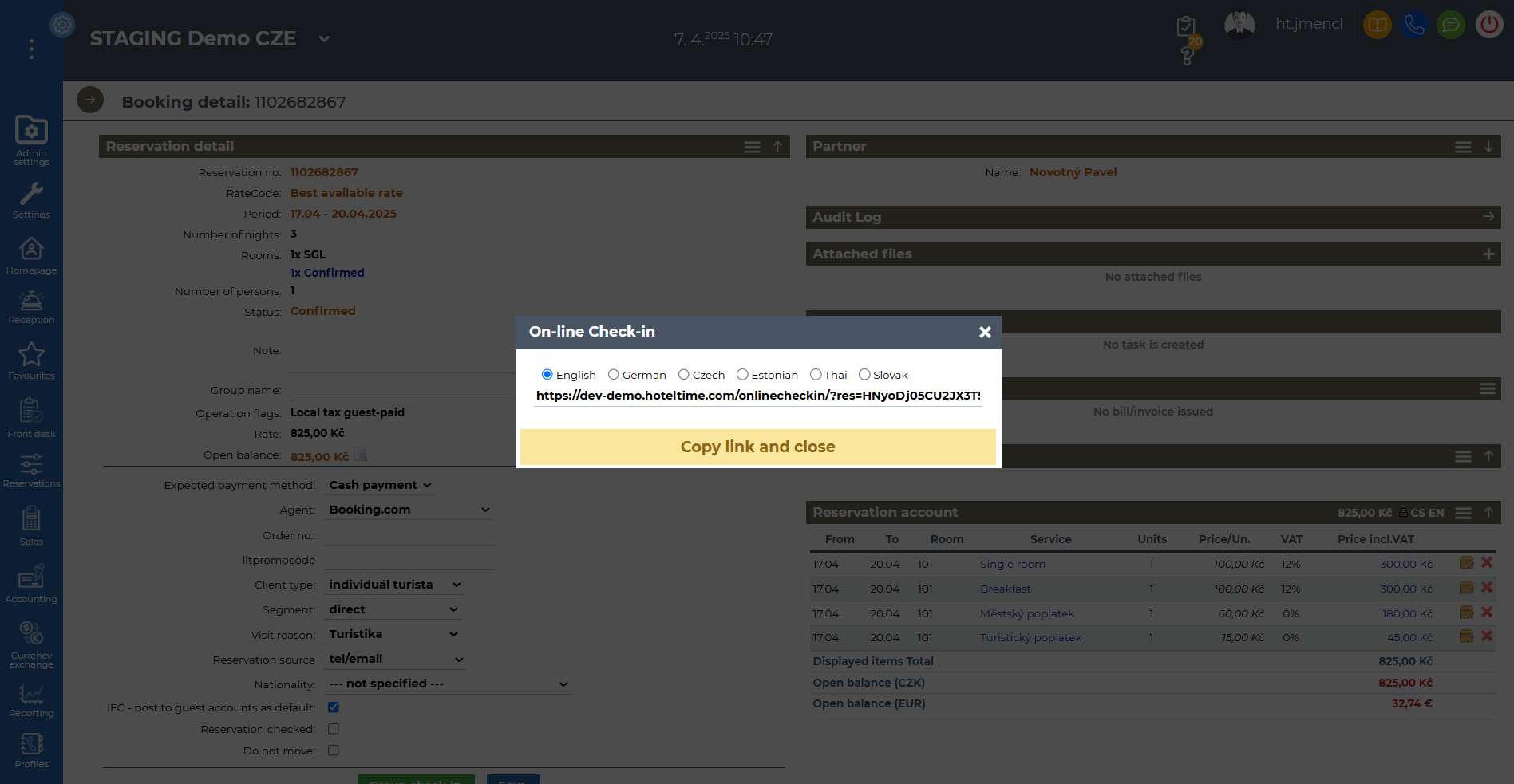 If you already have online check-in active, a link to the application can be easily generated directly from the reservation detail.